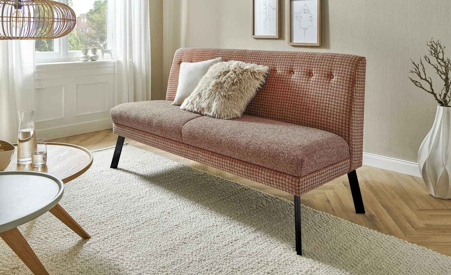 - Ausführung: Sitzfläche in meliertem, grobem Webstoff / Rücken und Korpus in Webstoff mit Hahnentritt-Muster