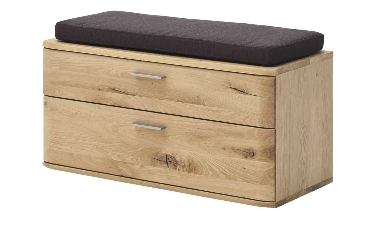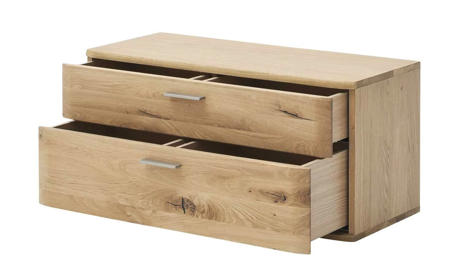 Mit der Garderobenbank Melle erhalten Sie Stauraum und eine Sitzgelegenheit für den Flur. Unterhalb der Sitzfläche ist Melle mit zwei Schubladen ausgestattet, wobei die untere etwas größer als die obere ist. Beide erstrecken sich über die gesamte Breite der Bank. Durch die Soft-Close Ausstattung schließen die beiden Schübe langsam und geräuscharm. Sitzfläche und Seiten sind mit Eiche Bianco furniert, die Front hingegen besteht aus massiver Balkeneiche Bianco. Um die Oberfläche zu versiegeln, ist das Holz mit einem Öl behandelt worden.