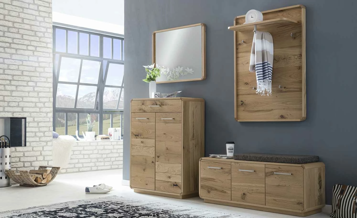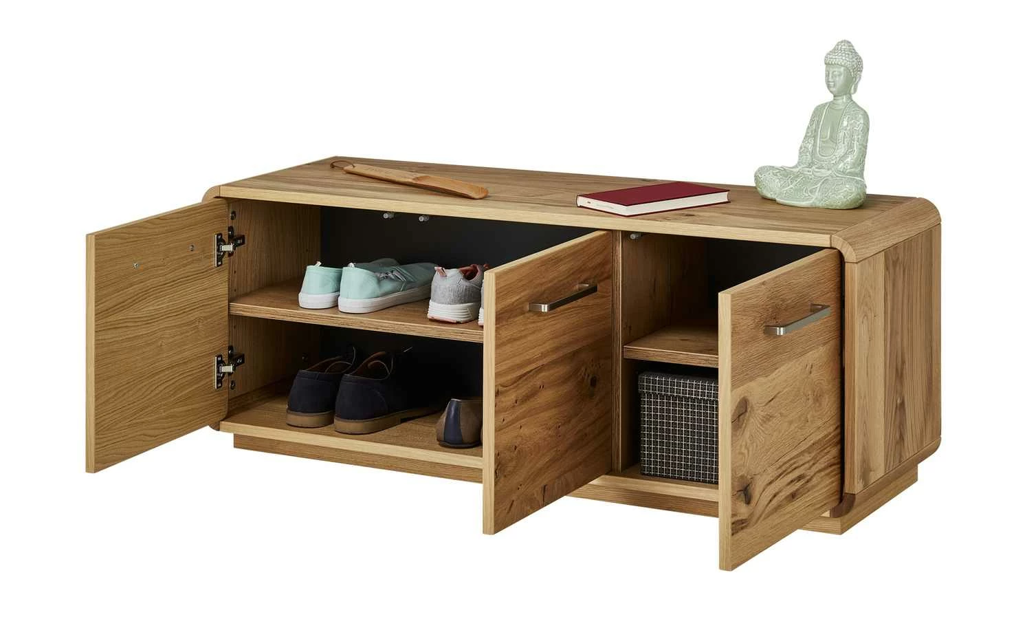 Die Garderobenbank Phönix fällt durch ihren eleganten, aber dennoch rustikalen Charme auf. Sitzfläche, Front und Korpus sind mit Balkeneiche furniert. Das Holz hat eine ausgeprägte Maserung mit Asteinschlüssen und Strukturunterschieden. Unter der Sitzfläche befindet sich praktischer Stauraum in insgesamt vier Fächern, in denen Schuhe verstaut werden können. Sie werden durch drei Türen vor Staub geschützt. Alle drei Türen verfügen über eine Soft-Close-Ausstattung für leises Schließen.
