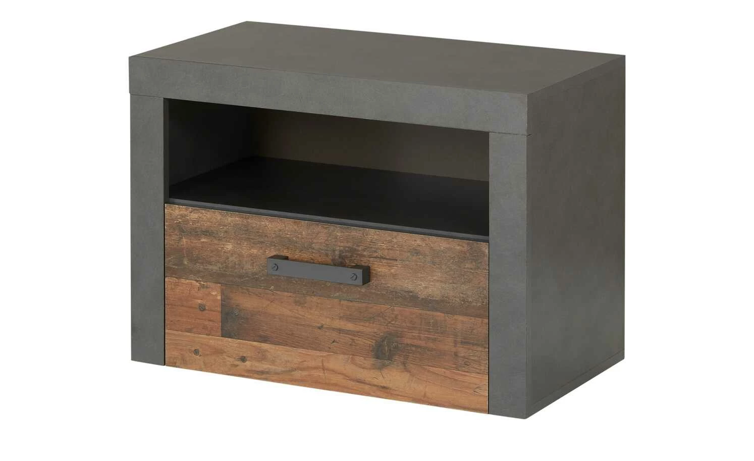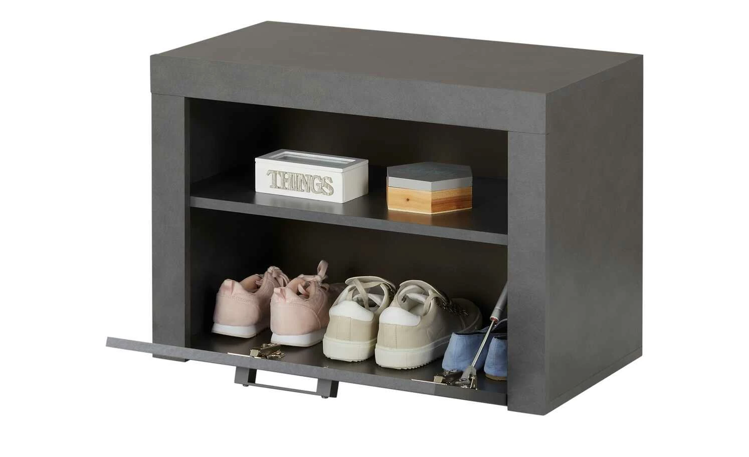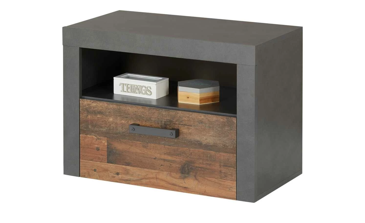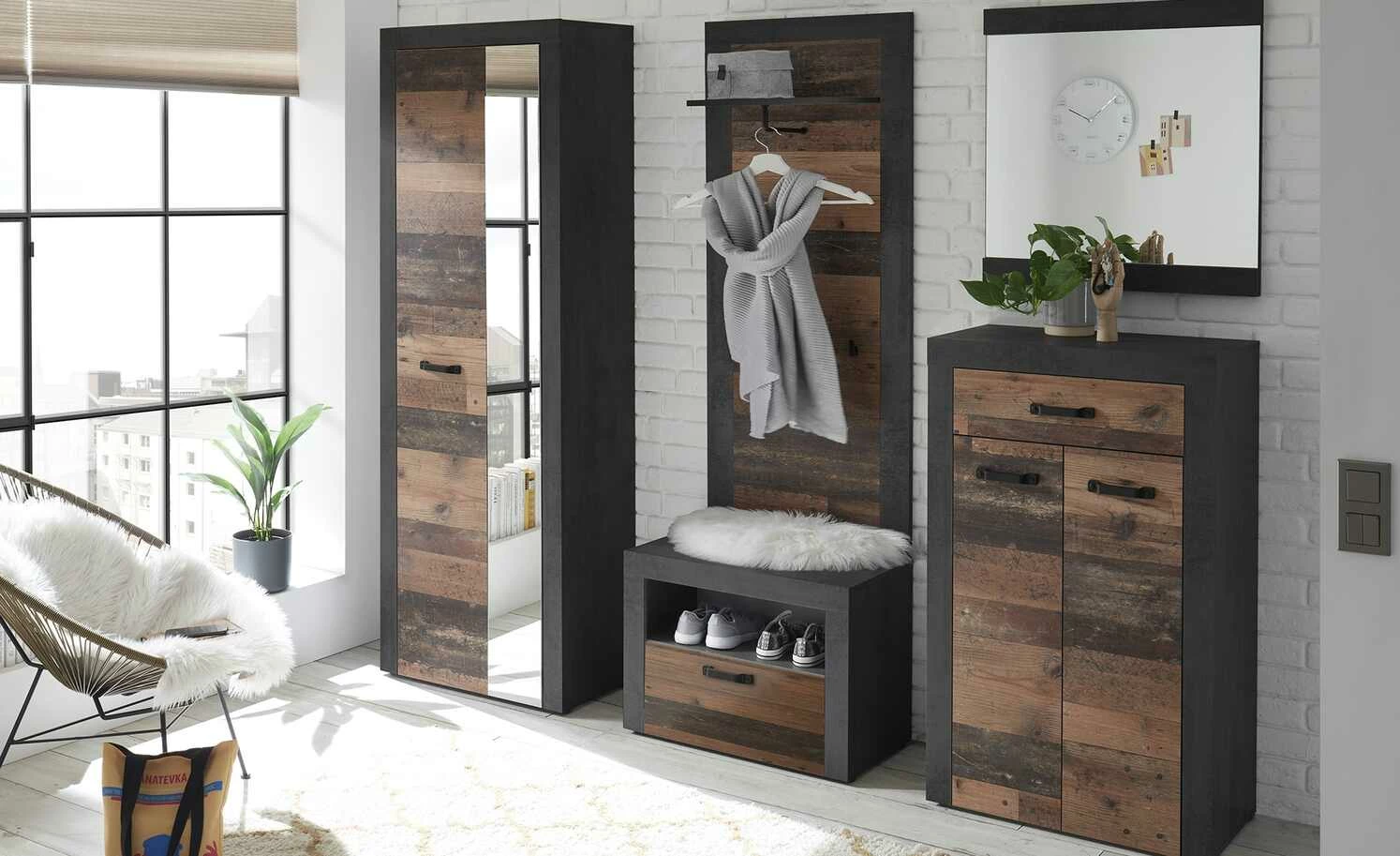 Klein aber oho! Diese Garderobenbank findet überall Platz. Auf der 50 Zentimeter hohen Garderobenbank können Sie sich zum Anziehen Ihrer Schuhe sogar ganz einfach hinsetzen. Wie die anderen Möbel der gleichnamigen Serie ist auch die Garderobenbank im trendigen Industrial-Style gehalten: Graphitgrau mit attraktiver Front in Altholz-Optik.