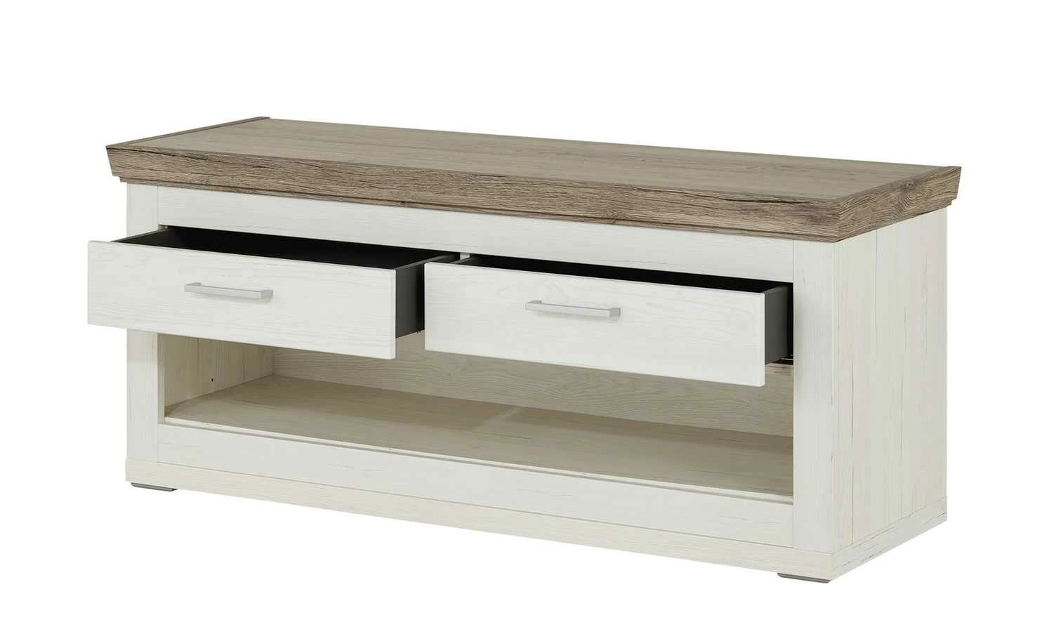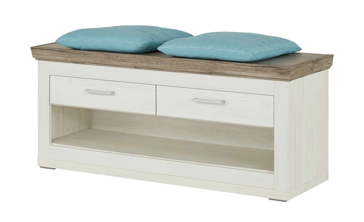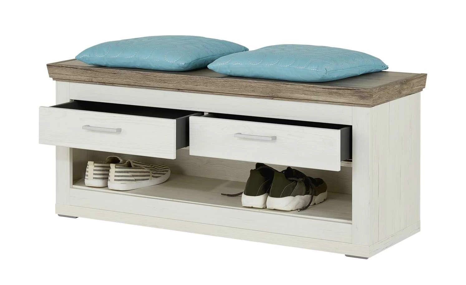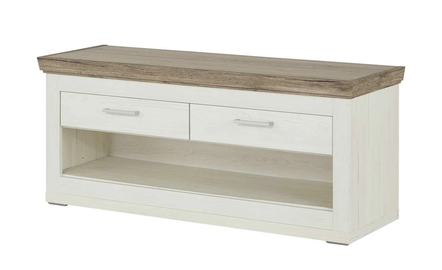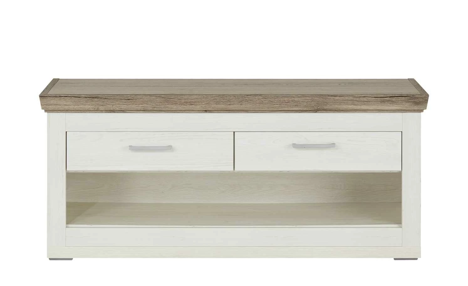 Das Anziehen der Schuhe ist doch im Sitzen deutlich komfortabler. Deshalb gibt es die Garderobenbank Bana. Sie ist eine tolle Sitzgelegenheit für den Flur. Und bietet gleichzeitig Stauraum. Im großen offenen Fach ist Platz zum Abstellen für Ihre Schuhe. Auch die beiden Schubladen können Sie gut nutzen. Sie sind mit einem Selbsteinzug ausgestattet. Bana hat eine helle, freundliche Optik in Pino Aurelio (Nachbildung). Die Sitzfläche setzt sich in Eiche San Remo Rustic (Nachbildung) ab.