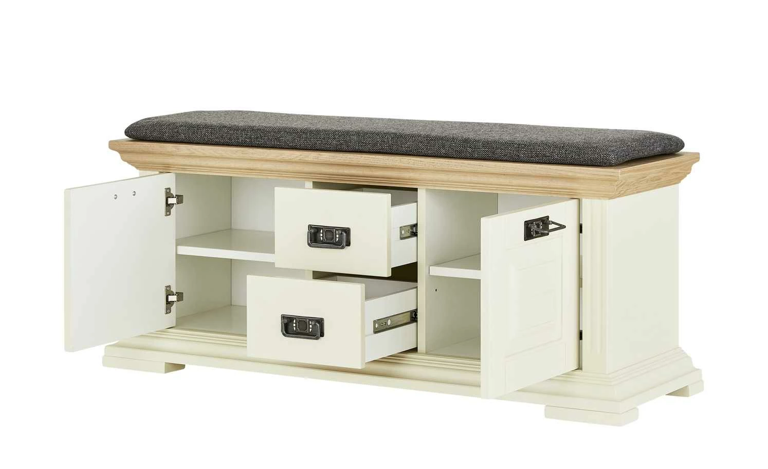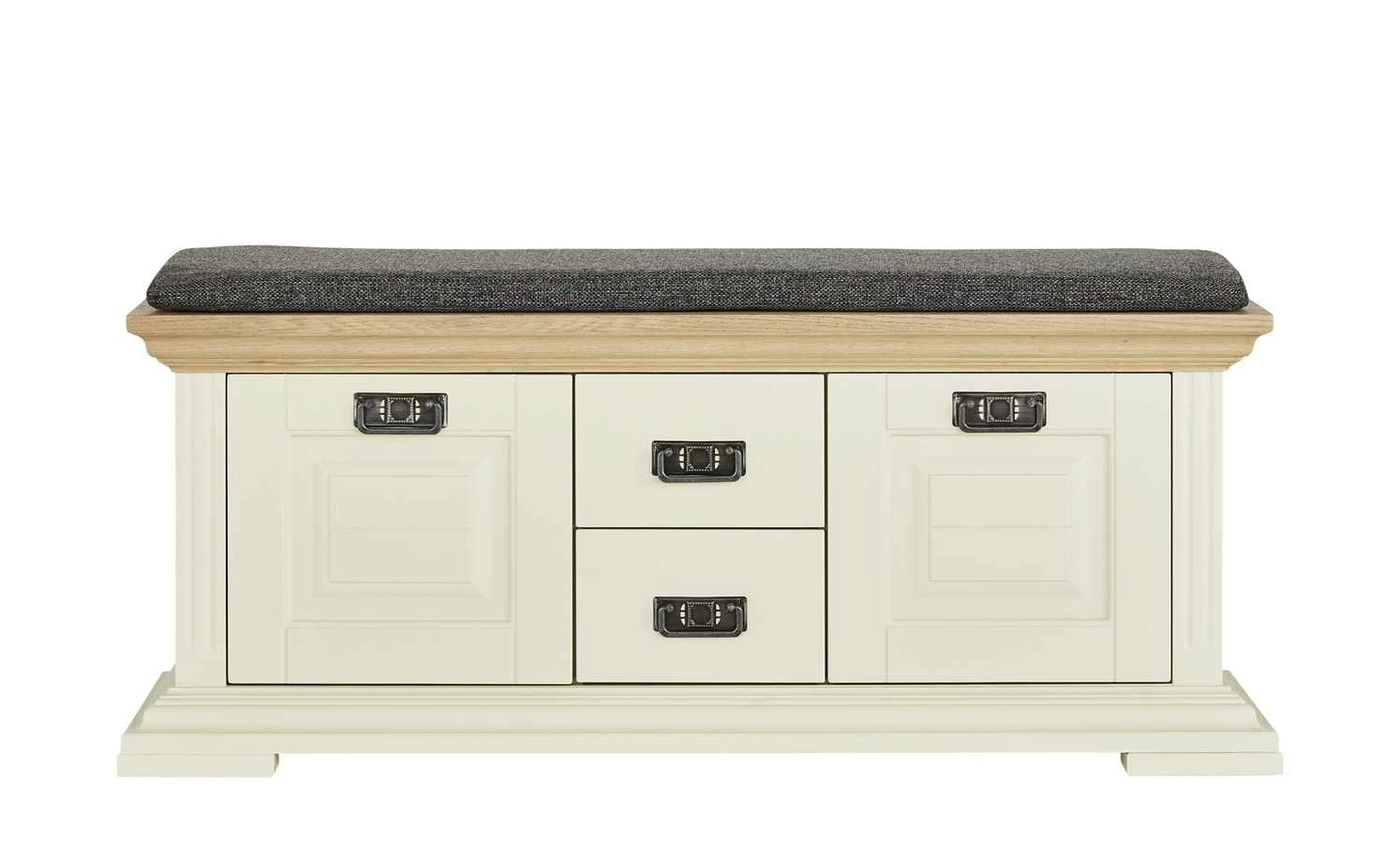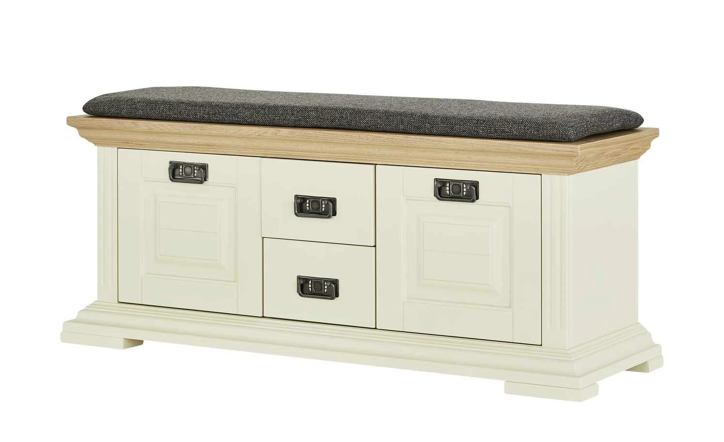 Die Garderobenbank Cremona von maison bleue ist ein dreifaches Highlight für den Flur: Sie ist attraktiv, sie bietet Stauraum und Sie können darauf sitzen. Cremona ist im Landhausstil designt und ist perlweiß lackiert. Einzig die Sitzfläche setzt sich in Eiche ab. Das stabile Massivholz ist gebeizt worden, hat seine holztypische Maserung dabei aber behalten. Ein weiches Sitzkissen mit anthrazitfarbigem Webstoffbezug ist im Lieferumfang enthalten. Für mehr Komfort beim Sitzen und Anziehen der Schuhe. Gleich acht Paare können in der Bank verstaut werden. Links und rechts sind jeweils zwei Fächer mit Türen davor zu finden. Weiterer Stauraum befindet sich mittig in den beiden Schubladen.