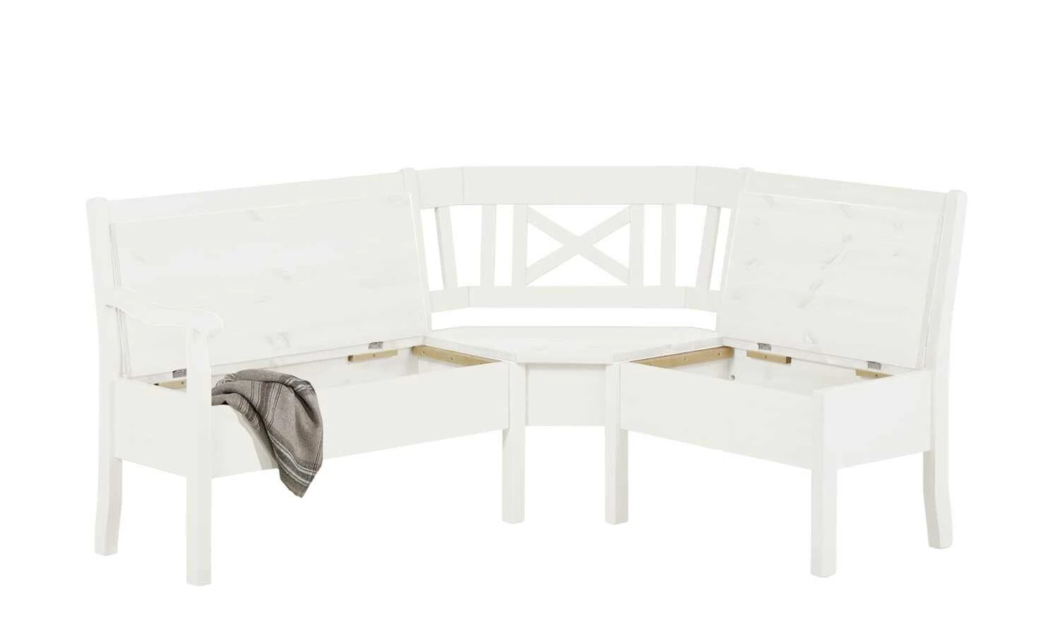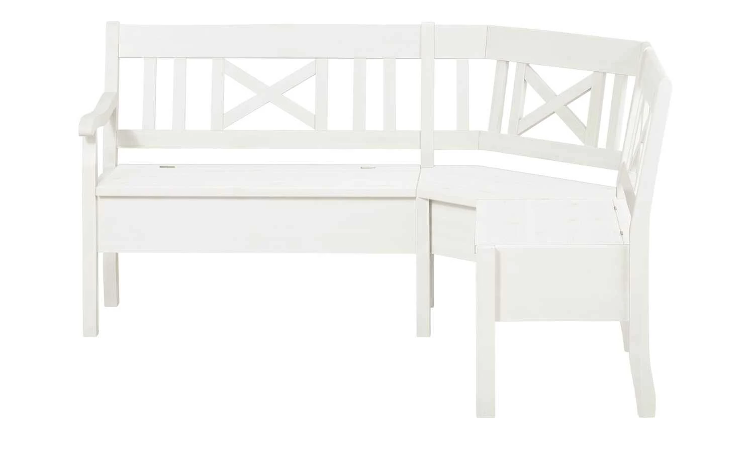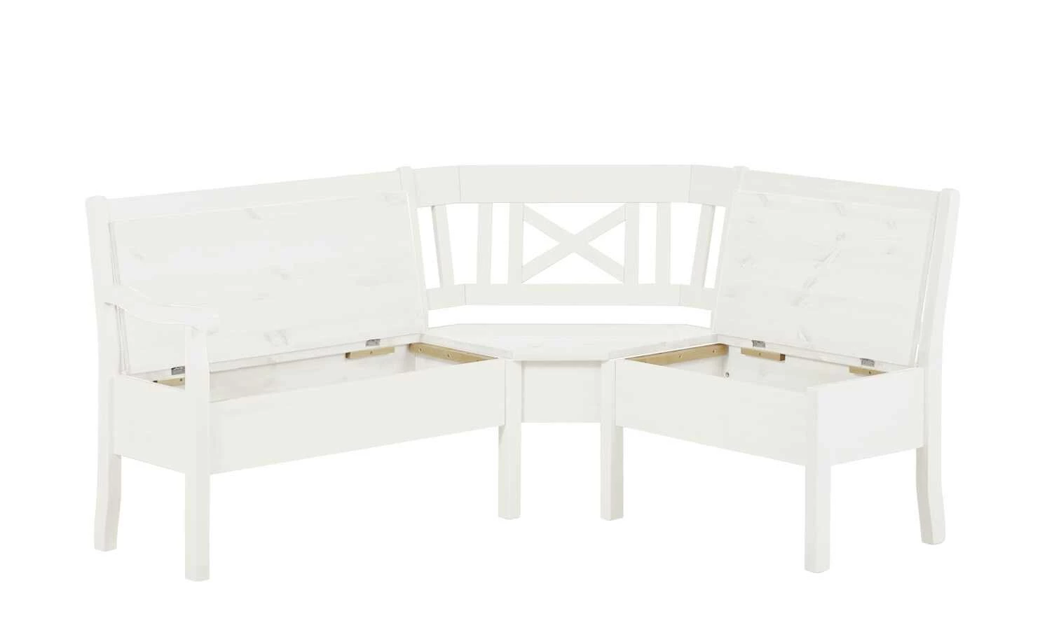 Mit ihrem charmanten Landhausstil ist die Eckbank Florian eine dekorative Sitzgelegenheit für Esszimmer oder Wohnküche. Florian besteht aus massiver Kiefer. Gestell und Rückenlehne sind gebeizt und weiß lackiert. Die Maserung des Kiefernholzes schimmert aber schön durch. Unterhalb der Sitzfläche verfügt Florian über Stauraum.