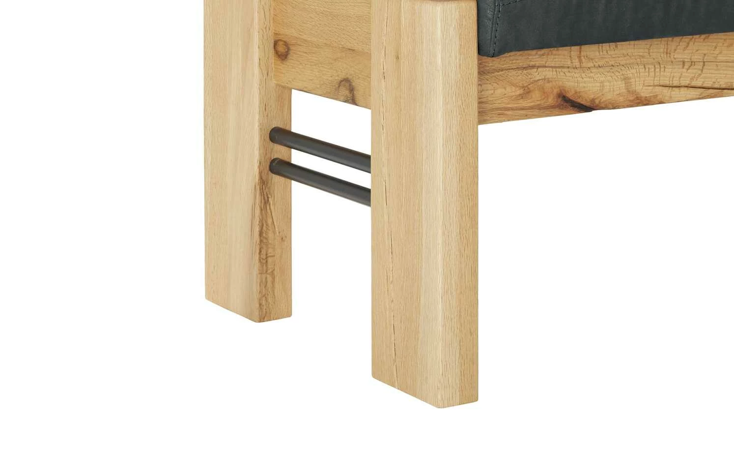 - Mehr zum Material: Abstandshalter in Balkeneiche massiv, Gestell in gerissener Balkeneiche natur mit Wachseffektlack, Metall-Verstrebungen an den Holzwangen in Roheisen Schwarz lackiert (mit künstlichen Gebrauchsspuren)