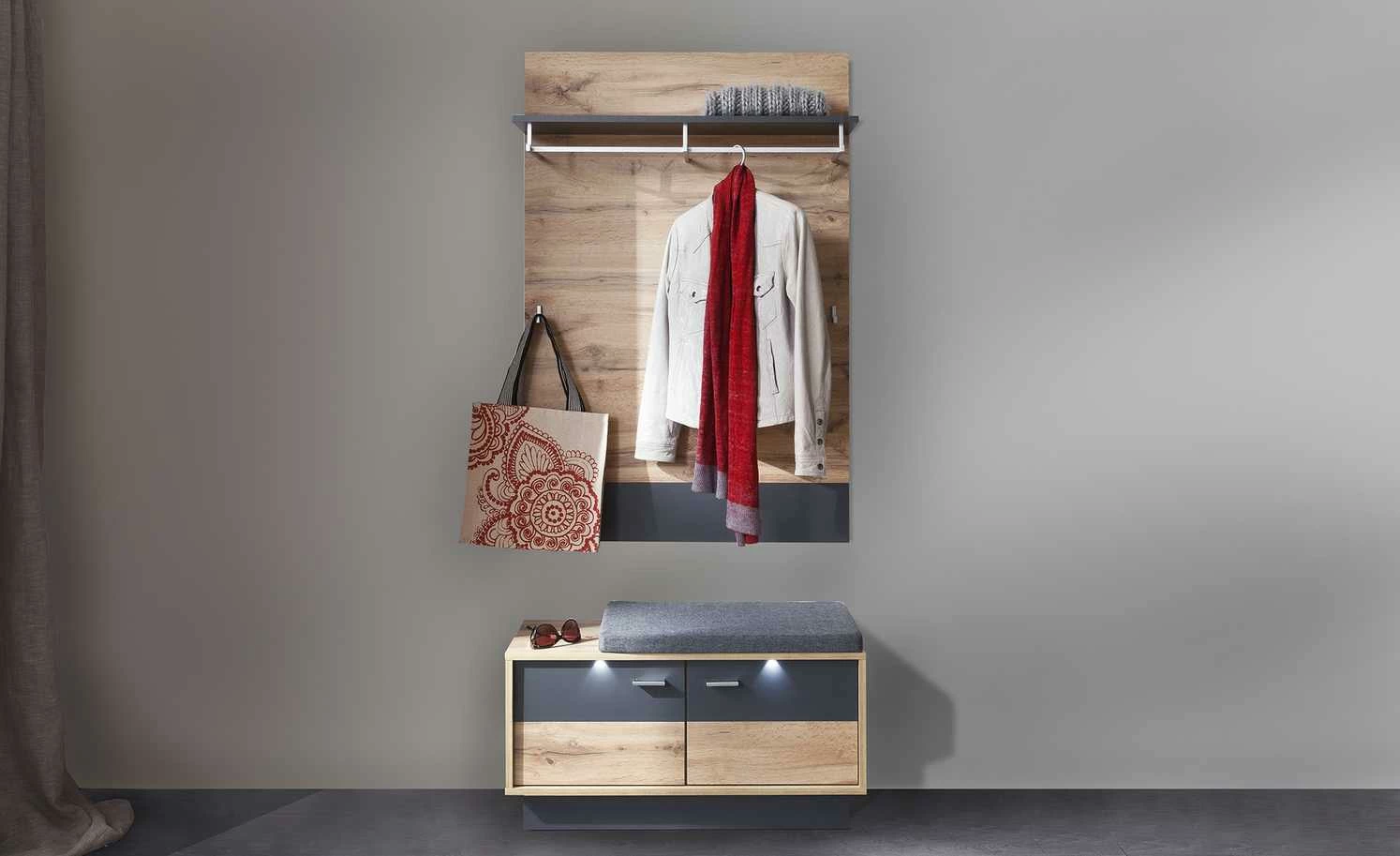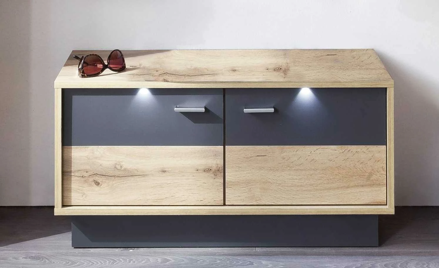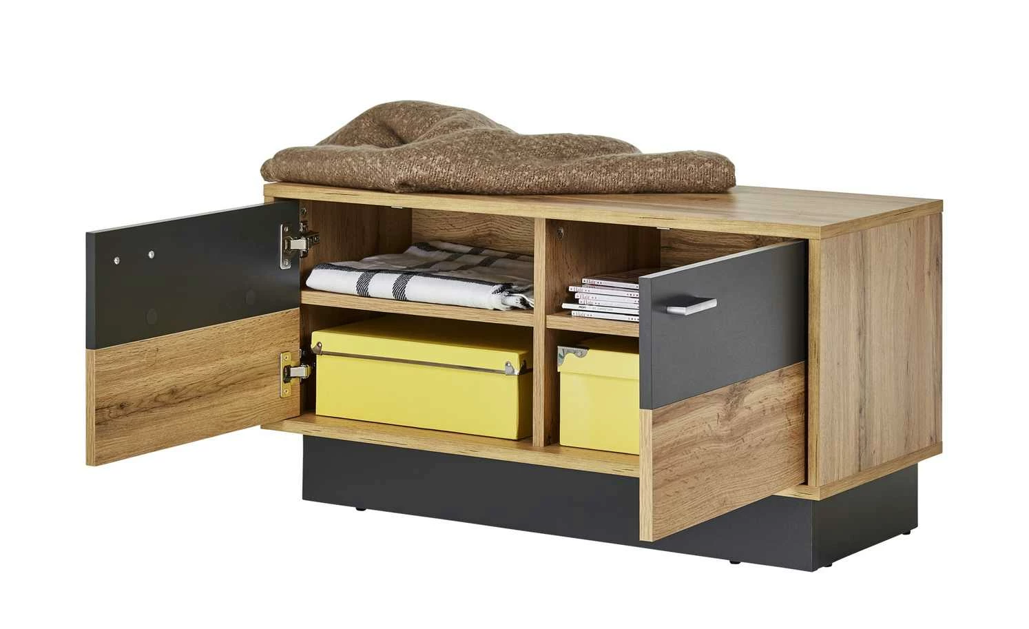 Innen verstauen, oben sitzen. Beides bietet die Sitzbank Champio. Unterhalb der Sitzfläche sind vier Fächer zu finden. Die beiden Türen davor schützen vor Staub und neugierigen Blicken. Die gesamte Sitzbank ist mit Melamin beschichtet, was die Oberflächen kratzerunempfindlich macht. Champio wird mit einer LED-Beleuchtung für die Front geliefert, sie bringt das Dekor in Eiche Wotan (Nachbildung) und die grauen Akzente schön zur Geltung.