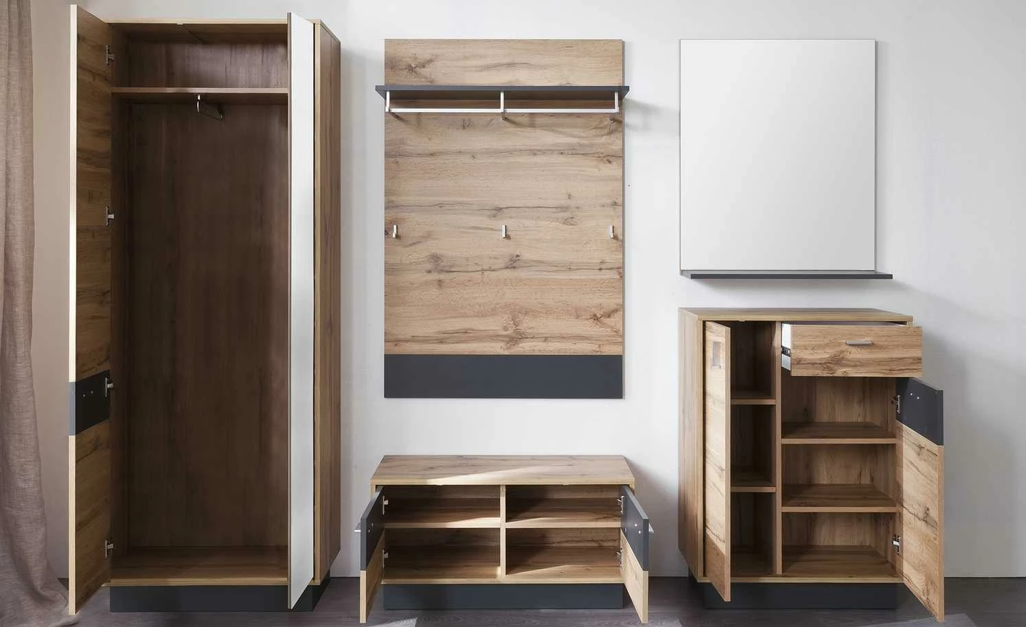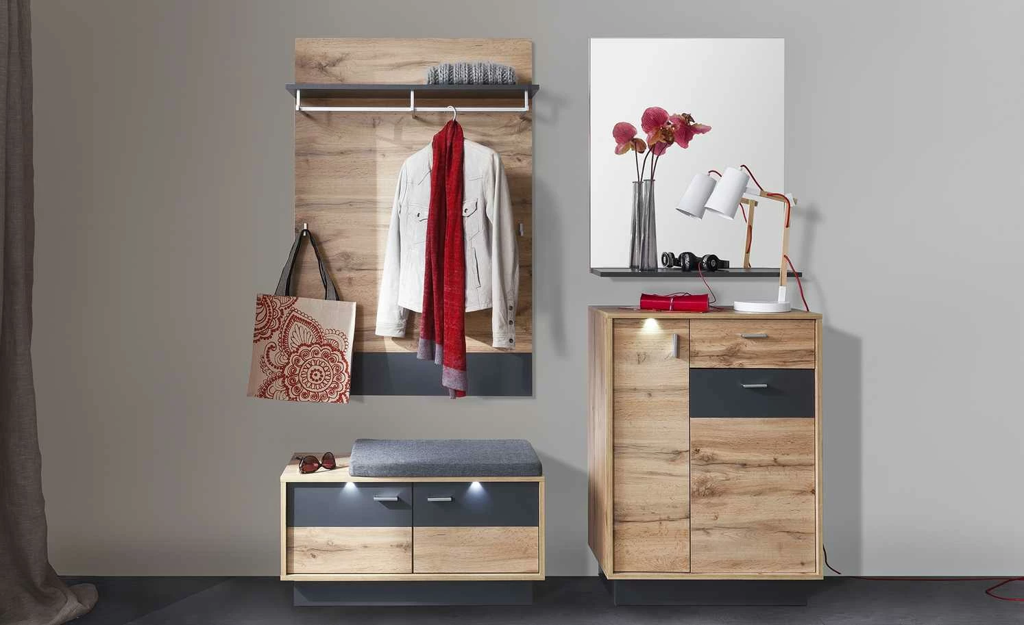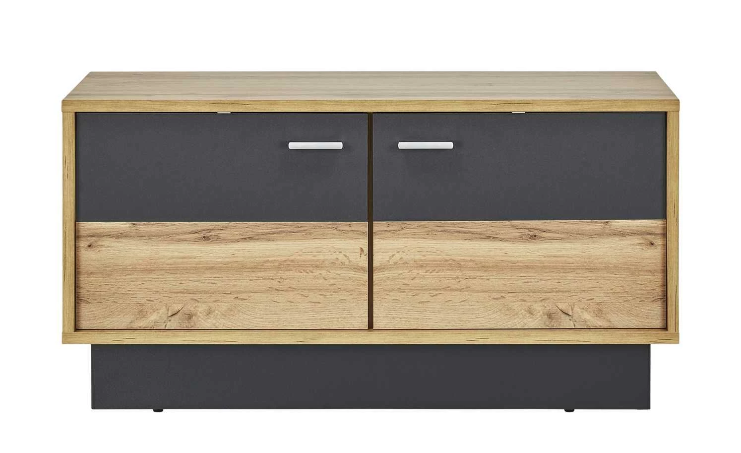 Innen verstauen, oben sitzen. Beides bietet die Sitzbank Champio. Unterhalb der Sitzfläche sind vier Fächer zu finden. Die beiden Türen davor schützen vor Staub und neugierigen Blicken. Die gesamte Sitzbank ist mit Melamin beschichtet, was die Oberflächen kratzerunempfindlich macht. Champio wird mit einer LED-Beleuchtung für die Front geliefert, sie bringt das Dekor in Eiche Wotan (Nachbildung) und die grauen Akzente schön zur Geltung.