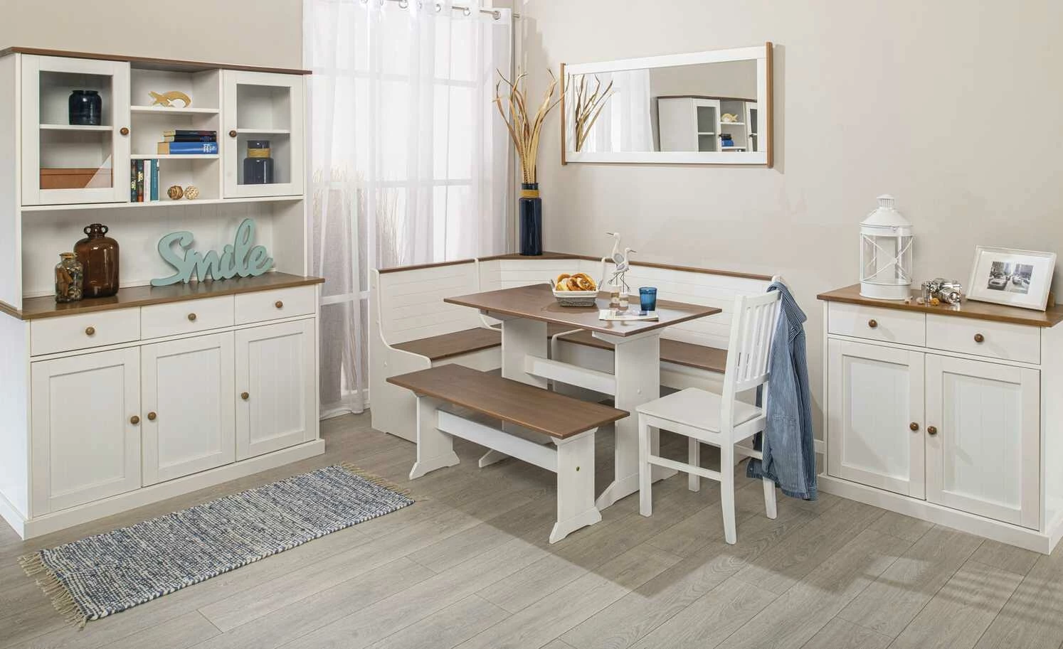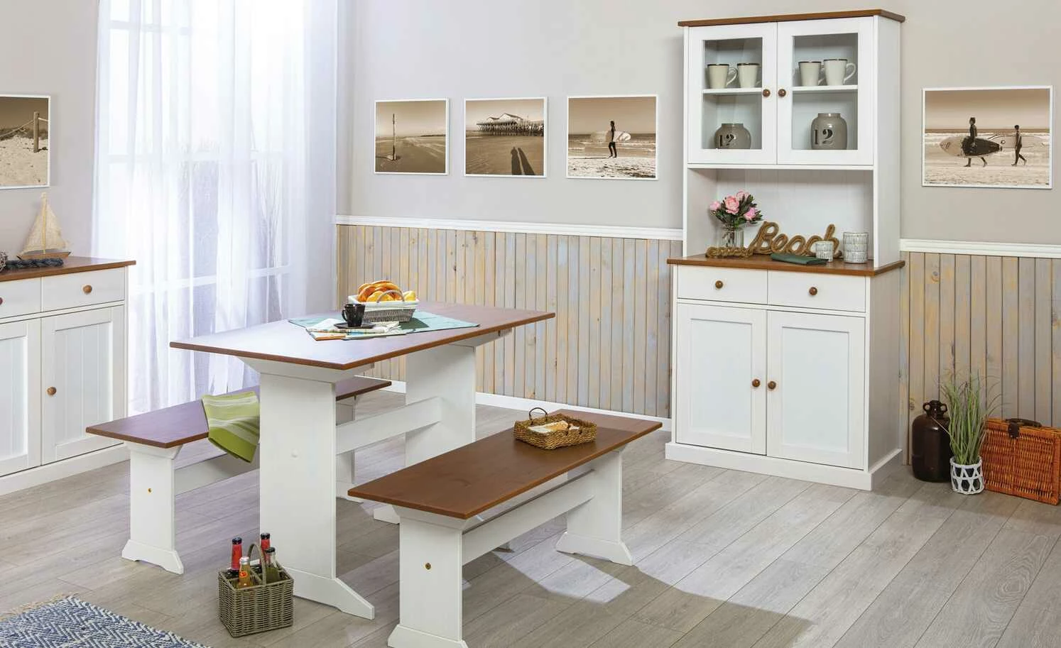 Die Sitzbank Muslone zeigt sich in charmantem Landhausstil. Sie besteht aus massivem, schön gemasertem Kiefernholz und ist dadurch robust und langlebig. Die braune Sitzfläche hebt sich vom weißen Gestell ab und betont den Landhausstil damit gekonnt.
