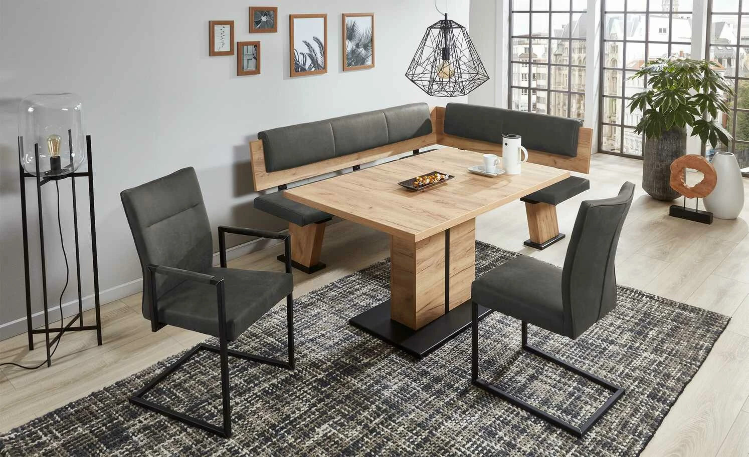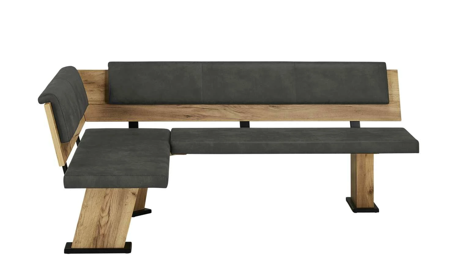 Machen Sie die Eckbank Mona von uno zum Highlight von Esszimmer oder Küche. Sie nutzt Ecken gekonnt aus und bietet eine Sitzfläche für mehrere Personen. Sitzbereich und Rücken sind weich gepolstert und mit einer Mikrofaser bezogen. Der dunkle Farbton setzt sich vom Dekor der Bank gekonnt ab. Die Struktureiche Terra (Nachbildung) fällt durch ihre ausgeprägte Maserung auf. Sie verfügt über angedeutete Risse und Asteinschlüsse. Da die Rückseite der Bank mit ihren Metallbügeln auch sehr stylisch aussieht, können Sie Mona auch mittig in den Raum stellen.